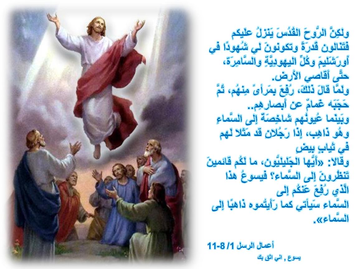 >خميس الصعود "وأخرجهم خارجاً إلى بيت عينيا ورفع يديه وباركهم وفيما هو يباركهم أنفرد عنهم وأصعد إلى السماء" (لو5:24) قال القديس يعقوب السروجى [ لقد جمع السيد المسيح تلاميذه على جبل الزيتون،ومن الزيتون يخرج زيت المسحة،ومن هناك أعطاهم سر المسحة ، لقد جمعهم إلى ذلك الجبل ليزودهم بالزيت ليرشم كل الأرض . أعطى المسحة من جبل الزيتون ولتكون لخلاص العالم كله00] . وعندما نتأمل فى جبل الزيتون نجد أن هذا الجبل هو الذى ذهب إليه السيد المسيح فى طريقه إلى الموت موت الصليب، هو هو نفس الجبل الذى صعد من عليه إلى السماء0 لكى يعطينا درساً إنه لايمكن أن ندخل نعبر إلى السماء إلا من خلال جبل التجارب والضيقات [إنه بضيقات كثيرة ينبغى أن ندخل ملكوت الله] (اع22:14) .صعد إلى السموات : صعد الرب يسوع المسيح إلى السماء ليؤكد حقيقة أنه ليس ملاكاً ولانبياً بل هو الله ذاته الذى هو بهاء مجده ورسم جوهره وحامل كل الأشياء بكلمه قدرته بعدما صنع بنفسه تطهيراً لخطايانا جلس فى يمين العظمة فى الأعالى ( عب 1 : 3 ) إذ [ليس أحد صعد الى السماء إلا الذى نزل من السماء إبن الإنسان الذى هو فى السماء] (يو13:3)0 ودعا نفسه إبن الإنسان ليؤكد حقيقة انه بالرغم من ألوهيته إلا أنه أخذ جسد تواضعنا من السيدة العذراء جسد بشرى كامل وليس جسد هيولى لذلك دعا نفسه بإبن الإنسان بحسب الجسد لكنه هو إبن الله بحسب الطبيعة الإلهية فلما أخذ جسدنا وصار بيننا أكد أنه هو هو الله ولكنه ظهر فى الجسد وقد أكد أنه من فوق بقوله [أنتم من أسفل أما أنا فمن فوق أنتم من هذا العالم أما انا فلست من هذا العالم ]0(يو23:8)0 بعض من الأنبياء صعدوا كما لو إلى السماء مثل إيليا وأخنوخ والقديس بولس الرسول إلى السماء الثالثة0 ولكن رب المجد يسوع المسيح صعد إلى السماء عينها بقوة لاهوته الذى لم يفارق ناسوته لحظة واحدة ولاطرفـة عين من بعد الأتحاد0 وقد ظن البعض أن صعود رب المجد يسوع المسيح إلى السماء من وحى الخيال ولكن أيوب الصديق أعلن بروح النبوة تصديقاً لصعود الرب صعود حقيقى وهو يتنبأ عن سر الثالوث القدوس قائلاً [من صعد إلى السموات ونزل ؟ من جمع الرياح فى حفنتيه؟ من صر الماء فى ثوب؟ من ثبت جميع أطراف الأرض؟ وما إسمه ؟ وما إسم إبنه إن عرفت ؟!! ] (ام4:30)0 فصعد الرب إلى السماء موطنه الأصلى مؤكداً الإشارات والنبوات التى تمت فيه وكان صعوده من قمة جبل الزيتون الذى كان فى مواجهة الباب الشرقى لأورشليم وحالياً يوجد على هذا الجبل كنيسة باسم الصعود0 لذلك الكنيسة فى صلواتها وكافة طقوسها تتجه إلى ناحية الشرق تجاه مكان صعود الرب ومجيئه الثانى مؤكداً ذلك ما قاله الملاكان للتلاميذ [أيها الرجال الجليليون مابالكم واقفين تنظرون إلى السماء أن يسوع هذا الذى أرتفع عنكم إلى السماء سيأتى هكذا كما رأيتموه منطلقاً إلى السماء] (اع11:1)0 صعد الرب إلى السماء لكى ما يصعد قلب الإنسان إليه فى الأعالى كما يردد الشعب عند سمعه قول الكاهن فى القداس الألهى أين هى قلوبكم ؟ فيجاوب الشعب ويقول هى عند الرب وليرفع نظر الإنسان من الأرضيات إلى السمائيات ( غير ناظرين إلى الأشياء التى ترى بل إلى الأشياء التى لا ترى لأن التى ترى وقتية وأما التى لا ترى فأبدية ) ( 2 كو 4 : 18)0 وجلس عن يمين أبيه: وجلس عن يمين أبيه تتميماً لقوله على فم داود النبى قائلاً[قال الرب لربى أجلس عن يمينى حتى أضع أعدائك موطئاً لقدميك ] ( مز 110 : 1) وقد شرح السيد المسيح هذه الأية الدالة على صعوده وجلوسه عن يمين أبيه ليؤكد لجماعة الفريسين أنه هو المكتوب عنه فى الأنبياء والمزامير بقوله لهم كيف يدعوه داود بالروح رباً قائلأ [ قال الرب لربى إجلس عن يمينى حتى أضع أعدائك موطئاً لقدميك ]0 أى كيف يدعوه رباً إلا إذا كان مؤمناً انه هو نفسه الرب الذى نزل من السماء0 وفى موضع أخر رد الرب يسوع على رئيس الكهنة قائلاً [من الأن تنظرون ابن الإنسان جالساً عن يمين عرش الله] (عب2:12) وكلمة عن يمين الله لايقصد بها أن الله محدود بحدود يمين ويسار وأمام وخلف حاشا لله أن يكون محدوداً بحدود فهو مالىء كل مكان ولا يحوي