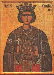 ولدت في الإسكندرية في أواخر القرن الثالث للمسيح، من عائلة شهيرة وسلالة ملوكية، ونشأت على حب الفضيلة وشغفت بالطهارة الملائكية، وأقبلت منذ حداثتها على اقتباس العلوم العصرية وقراءة الكتب المقدسة. ويروى أن المسيح تراءى لها بعد اعتمادها مبدياً رضاه عنها، وألبسها خاتماً ثميناً عربون خطبته إياها عروساً له. ففرحت فرحاً عظيماً وشغفت بمحبته ونذرت بتوليتها له. كانت مصر تابعة لإمارة مكسمينس الإمبراطور مضطهد المسيحيين، وأراد هذا أن يبهر مصر بغناه. فأمر بإقامة عيدٍ حافلٍ تقدم فيه الذبائح للأوثان، ويشترك فيه كل الشعب. فارتاع المسيحيون، فأخذت كاترينة تشجعهم وتضرم نار الغيرة في نفوسهم. وحضرت بنفسها أمام الملك يوم الاحتفال وطلبت إلى الإمبراطور مكسمينس أن يسمعها. فلما رآها أُخذ بجمالها، فسأل عنها وقرّبها إليه، فأخذت تبين له ضلالة الوثنية وصحة الإيمان المسيحي، وأثبتت له من فلاسفته الوثنيين وحدانية الله. فاستولى عليه الذهول، ولأنها فتنته بسحرها، قال لها:"لا بأس سوف أسمعك بعد تقديم الذبائح"، وفرح المسيحيون بجرأتها. ولما عاد الإمبراطور إلى قصره، استدعاها واستفسر عن اسمها ونسبها، فبيّنت له أن أجدادها من أشراف المملكة، وأنها أوقفت حياتها سعياً وراء الحقيقة وأنه لا أشهى إليها من أن تراه مع المملكة يعترفون بالمسيح. فأجابها برفق أنه لا يعرف الفلسفة وأنه سيأتي بمَن يُفحمها. وذاع هذا الخبر في مصر كلها وجاء بخمسين فيلسوفاً ليناظروا الشابة كاترينة… أما كاترينة فأفحمتهم بقوة براهينها. فأكبر الحاضرون علمها الغزير وفصاحتها الخارقة وكادوا أن يصفقوا لها لولا خوفهم من الإمبراطور. فالتفت الإمبراطور إلى العلماء فأجاب عميدهم:"إن ما قالته كاترينة لهو عين الصواب". وكذلك قال العلماء الآخرون. فغضب الإمبراطور وأمر بإحراقهم بالنار ففازوا بإكليل الشهادة. وكان الإمبراطور قد علق بهوى كاترينة فدعاها وعرض عليها الزواج ولبس الأرجوان فرفضت بعزّة نفس وقالت:"إن مَن عاهدت المسيح لتكون عروساً له لا تخونه". فأمر بجلدها حتى تناثر لحمها، وأودعها السجن حيث ظهر لها ملاك الرب وعزاها وشفى جراحها. ولما عاد مكسمينس من سفره، أحضر كاترينة إليه فوجدها صحيحة، فعرض الزواج عليها ثانية فرفضت. فأمر بأن تُصنع آلة جهنمية خاصة بها ليمزق بها جسدها، وازدراها وأعادها إلى سجنها. وبعد موت زوجته استدعى كاترينة ثالث مرة وعرض عليها الزواج، فازدرت كاترينة قاتل امرأته وسافك دماء الأبرياء. فأمر بأن يجعلوها على تلك الآلة الجهنمية. فلما جيء بالآلة انفجرت وتكسرت وقتلت الجلادين. فعيل صبر مكسمينس وخاف سوء العاقبة، وأمر جنده أن يأخذوها إلى خارج المدينة ويقطعوا رأسها. فخرجت وهي تصلي وطلبت إلى عريسها أن لا يدنس أحد جسدها بعد موتها. فأحنت رأسها للسيف وهي تصلي وبذلك تمت شهادتها سنة 308. ويقال إن أحد النساك على عهد الملك يستنيانس وجد جسدها على جبل سيناء فدفنه الرهبان هناك، وبنوا كنيسة وديراً على اسمها لا يزالان قائمين إلى اليوم… وتعتبرها الكنيسة شفيعة الفتيات والعذارى والفلاسفة معاً. نعجتك يا يسوع تصرخ اليك بصوت عظيم قائلةً : اليكأصبو يا عروسي. وايّاك أطلب بجهادي. وأصلَب وأدفن معك بمعموديتك وأكابد الآلام من أجلك لكي أملك معك وأموت فيك لكي أحيا بك . فتقبّل التي ضُحيتْ لك عن ارتياحٍ كذبيحةٍ لا عيب فيها . وبشفاعاتها خلّص يا رحيم نفوسنا